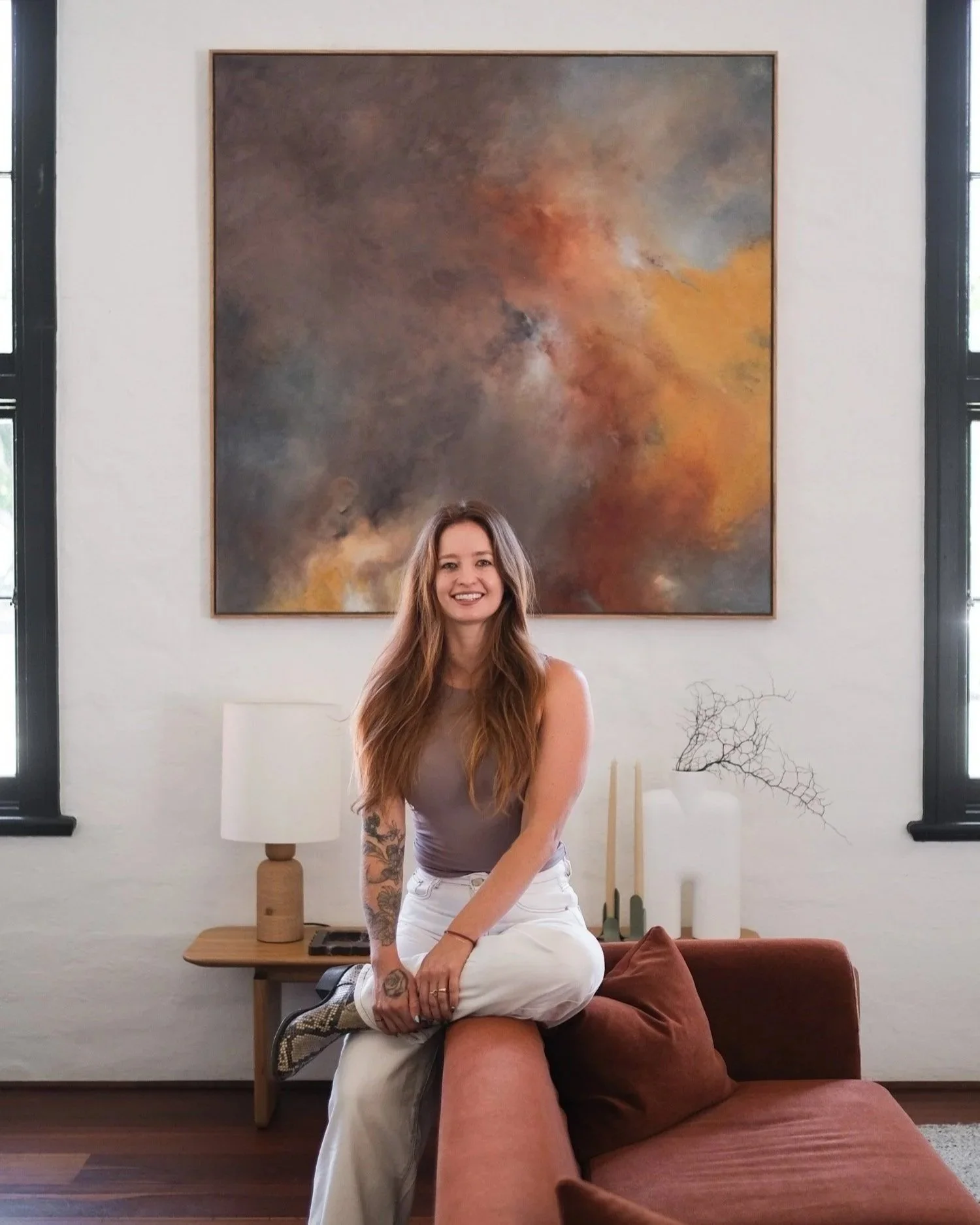 Jessyjo Darling is an earth pigment artist dedicated to the practice of turning soil and stone into paint using time-honored techniques. Born in Western Australia, she works nomadically between California and Australia, creating site-specific works that carry the memory of the landscapes from which they are gathered. Her early inspiration came from her grandmother, Jo; an accomplished painter who would commission small aircrafts to capture aerial photographs as references for her abstracted landscapes. This early exposure to scale, land, and perspective deeply shaped Jessyjo’s ownrelationship to place. Jessyjo later pursued a Bachelor of Design in Melbourne before relocating to New York, where she gained professional experience across fashion, graphic design, and architecture; disciplines that continue to inform the material precision and spatial sensitivity of her practice.
